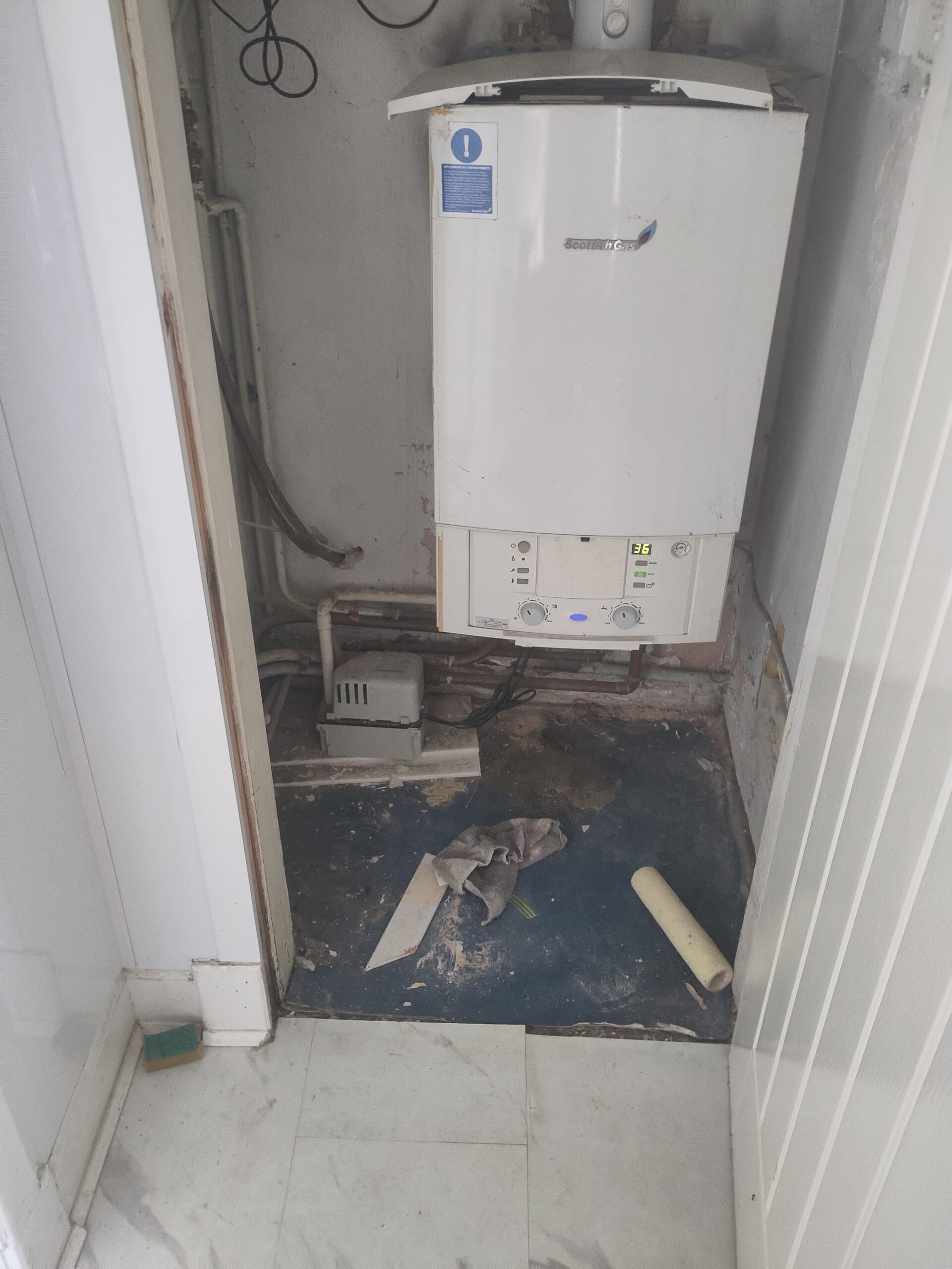 Day 1 was mostly removing the old gas boiler, draining the system, and preparation work. The concrete base stands for the heat pump were created. The new electrical sub board for the heat pump was installed, with the house power off for a short time to connect this in. Once the boiler was out in the morning we had no water from the hot taps.