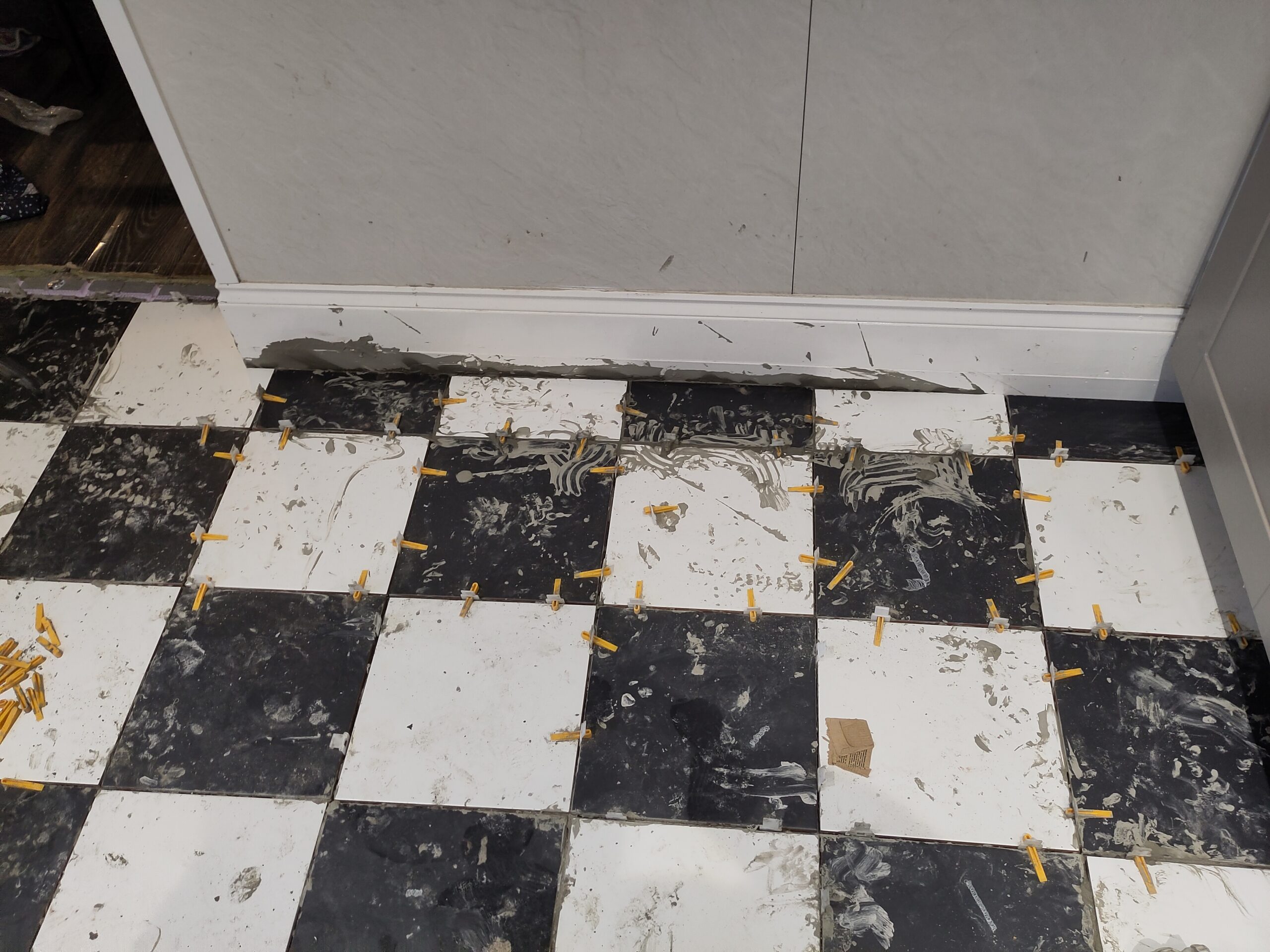 No concrete screed was needed, which puts the room completely out of use until it’s dry. It’s also quite costly and time consuming to install the concrete screed. With this backer board solution we could strategically lay the tiles to keep use of the kitchen whilst being careful where we stepped and leaning over at times.