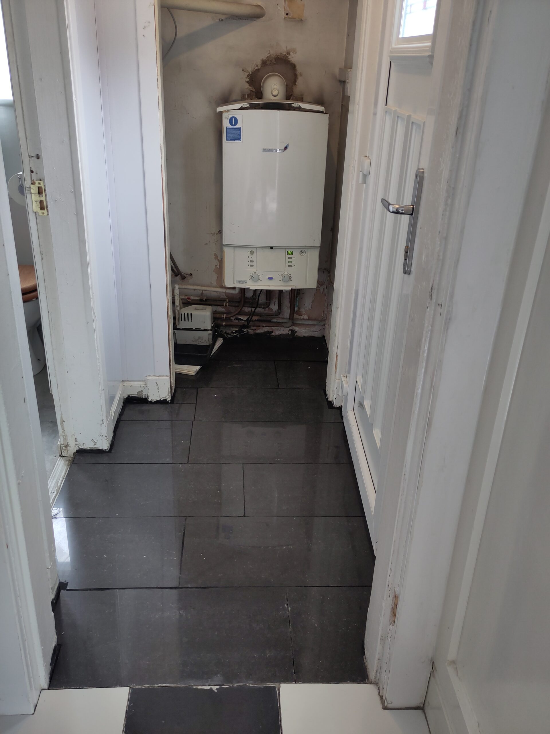 In the kitchen we got the installer to remove the thin leaking radiator, capping the pipes in the ceiling. This was replaced with underfloor heating. The heating installer came in early week 1 to install the underlay and underfloor heating pipes. We then had just under a week to get most of the tiles stuck down, particularly in the cupboard that the new hot water cylinder would be installed. The installer used an insulated board with pre-cut grooves for the underfloor heating pipes. We then used the tile adhesive directly on the boards and pipes with the tiles on top, making it an easy process. The hardest part was trying to get the tiles level everywhere.